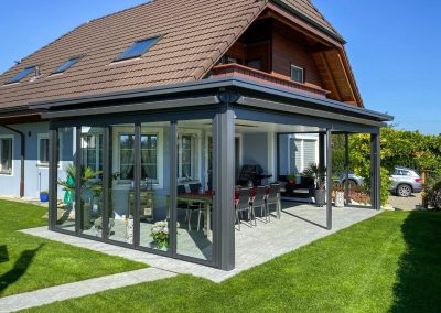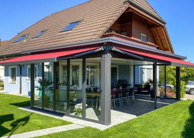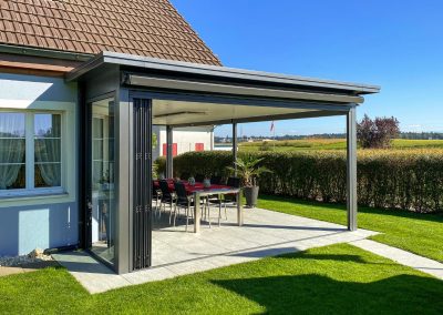 Auf den Seiten gegen Süden und Westen wünschte der Kunde eine Gelenkmarkise mit Sonnenschutz. Die Senkrechtmarkisen können an der Front zusätzlich auf Wunschhöhe angepasst werden und dienen ebenfalls als Sichtschutz. Decke innen mit weiss gestrichener Holzplatte. An beiden Seiten sind faltbarbare Fensterelemente angebracht, die platzsparend geöffnet werden können. Auf der Konstruktion wurde eine EPDM-Folie verlegt, die mit Rundkies abgedeckt wird. Der ursprüngliche Balkon im Obergeschoss integriert sich bestens über die Konstruktion hin.