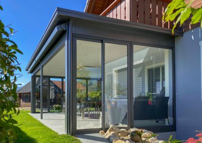 Die einfachste Form einer BERNA Terrassenlounge. Die Holzkonstruktion ist sichtbar, lediglich das Stirnbrett und die Stützen sind mit Aluminium verkleidet. Auf der Wetterseite wurde diese Überdachung mit einer Senkrechtmarkise als Schutz gegen den Wind und die tiefstehende Abendsonne ausgestattet.
