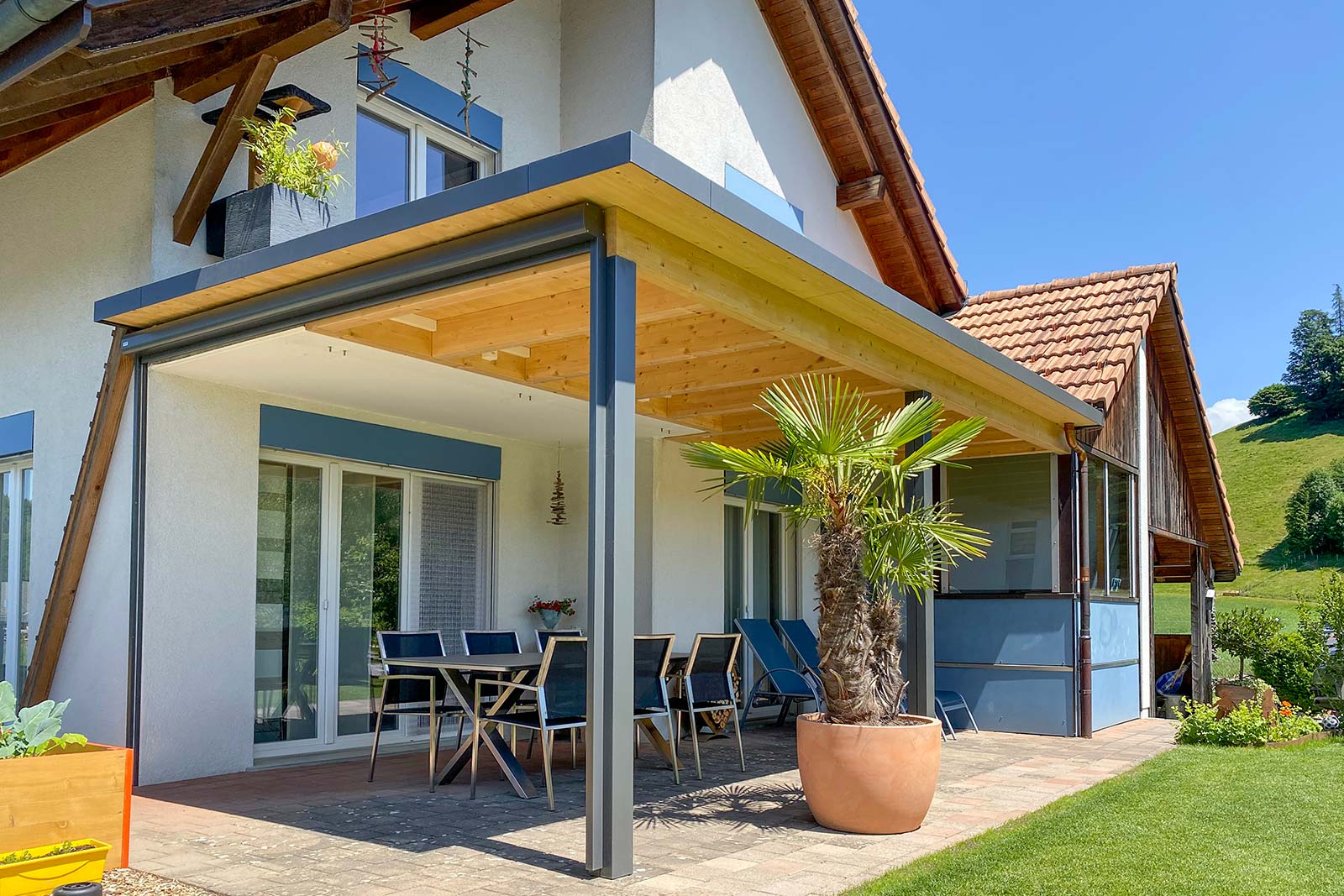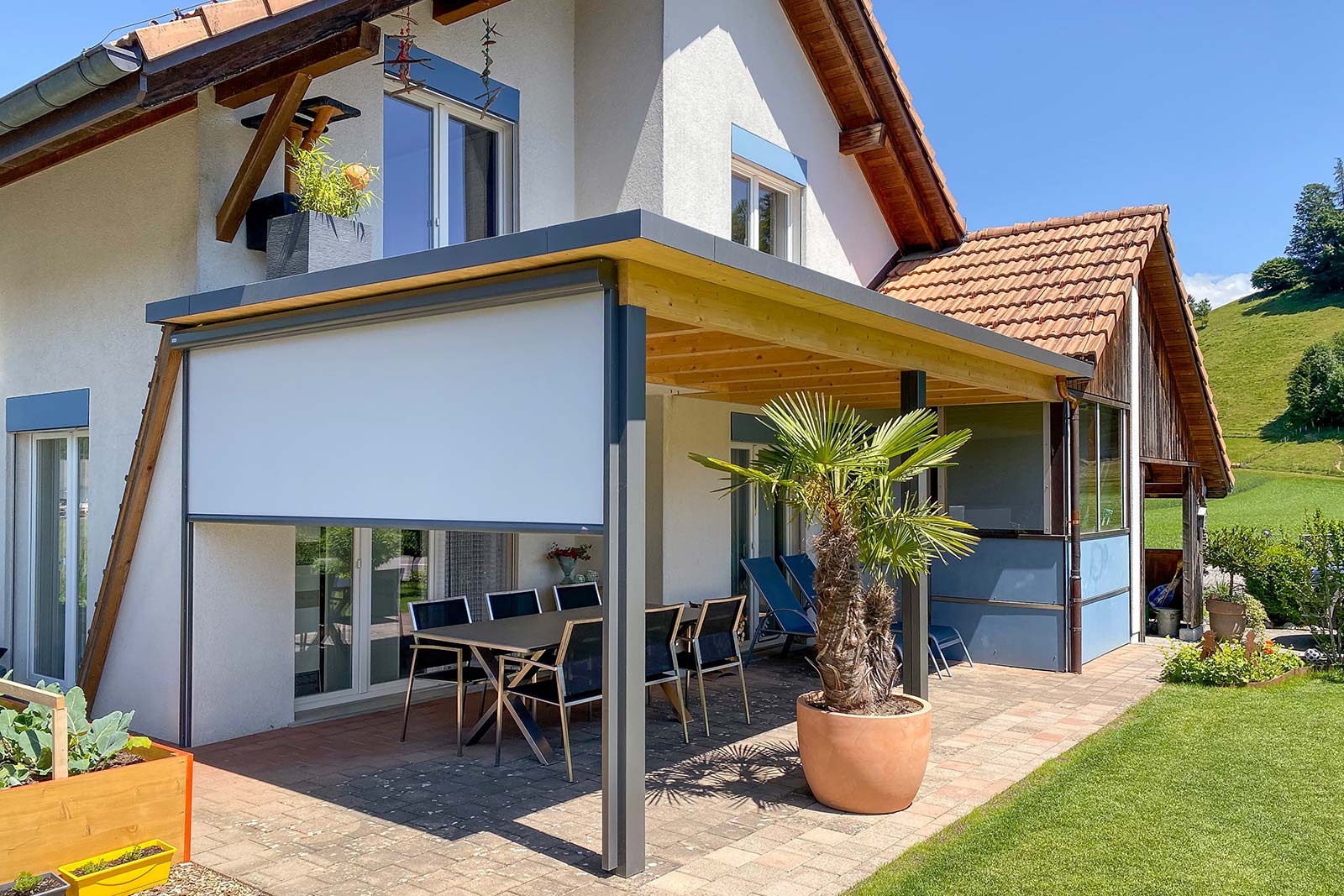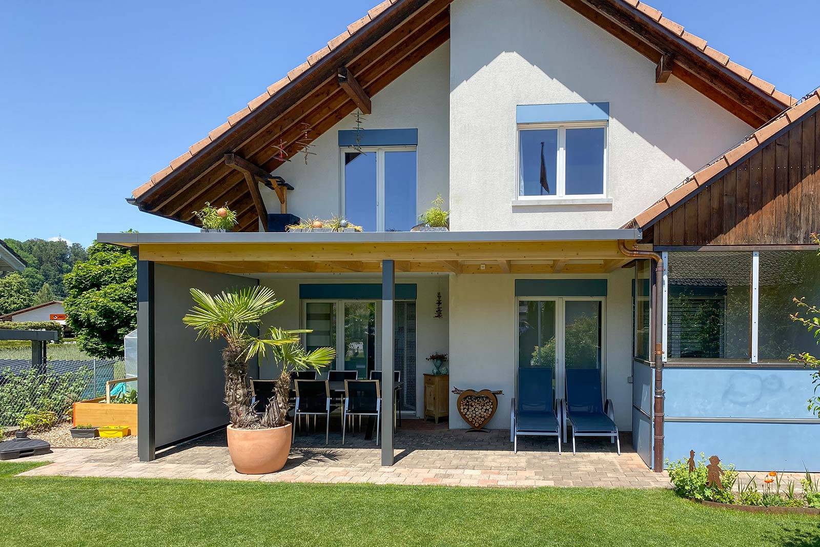 Die einfachste Form einer BERNA Terrassenlounge. Die Holzkonstruktion ist sichtbar, lediglich das Stirnbrett und die Stützen sind mit Aluminium verkleidet. Auf der Wetterseite wurde diese Überdachung mit einer Senkrechtmarkise als Schutz gegen den Wind und die tiefstehende Abendsonne ausgestattet.