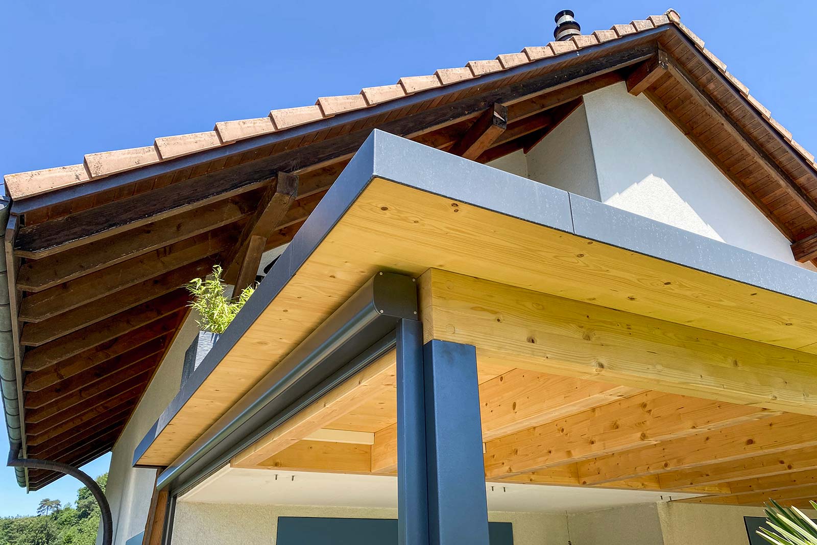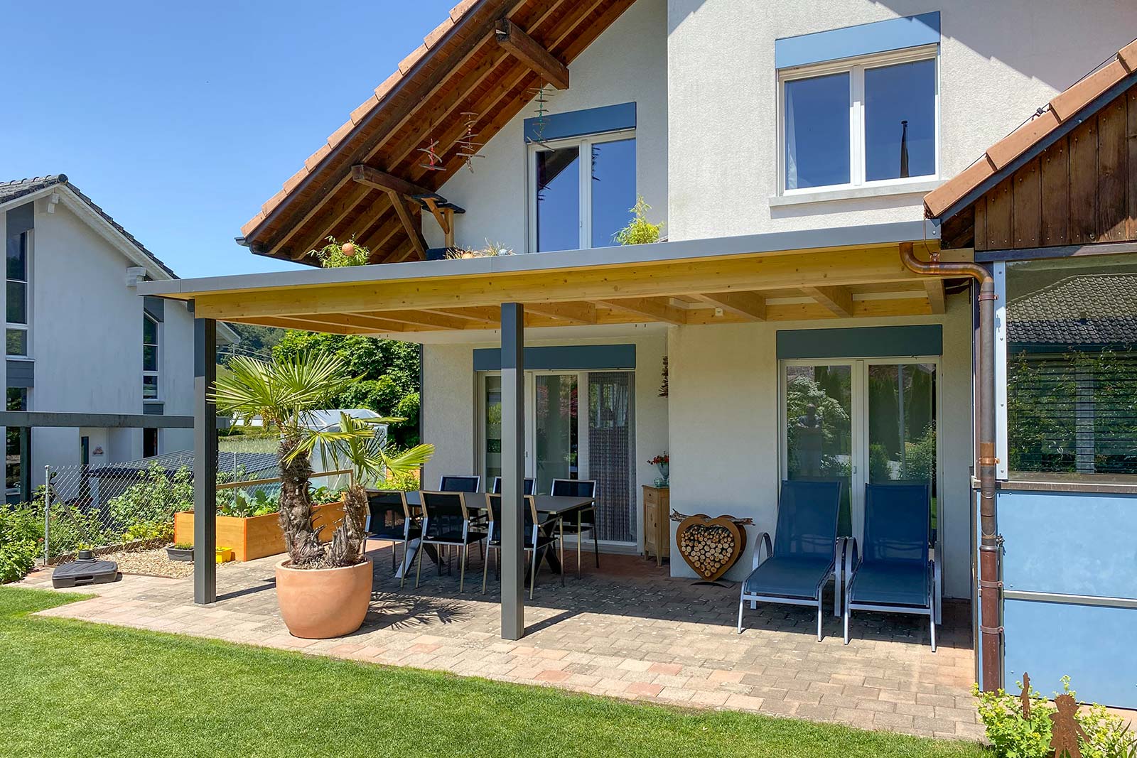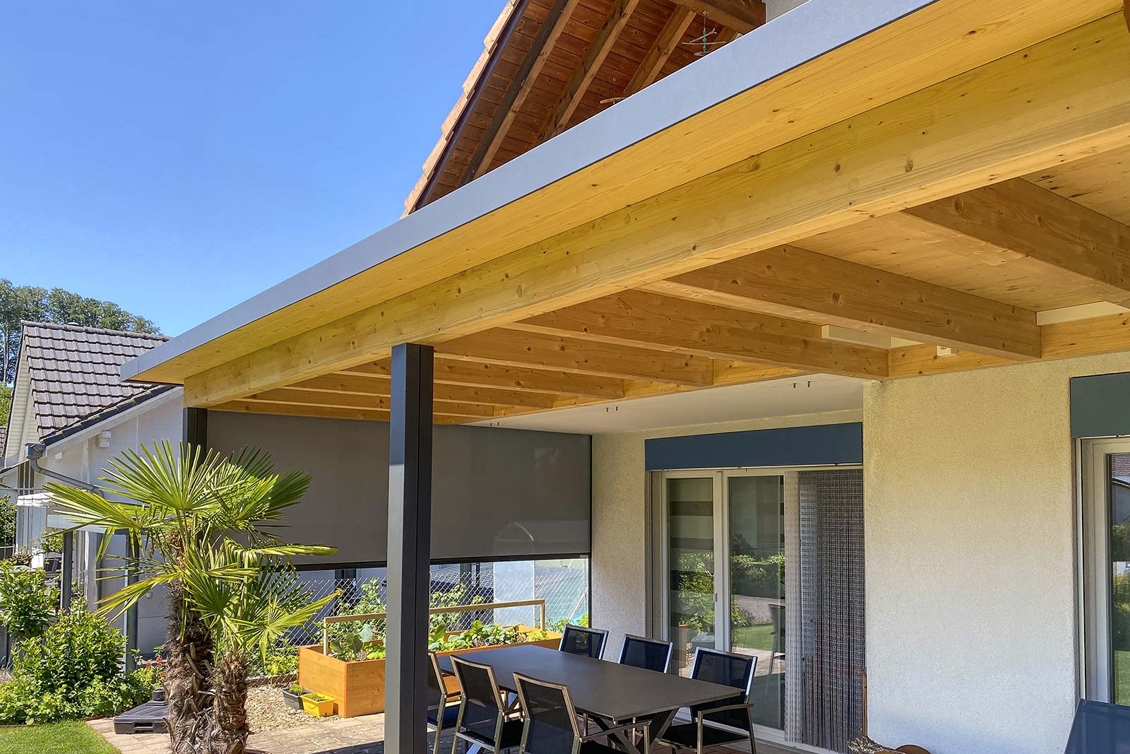 Eine flexible Anbindung an das bestehende Gebäude ist genauso möglich wie eine freistehende Konstruktion. Die Deckenuntersicht kann individuell ausgeführt werden: als sichtbare Holzkonstruktion, mit gestrichener Holzplatte, mit Täfer oder verputzter und gestrichener Gipsplatte.