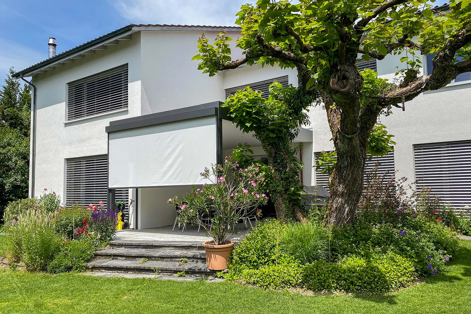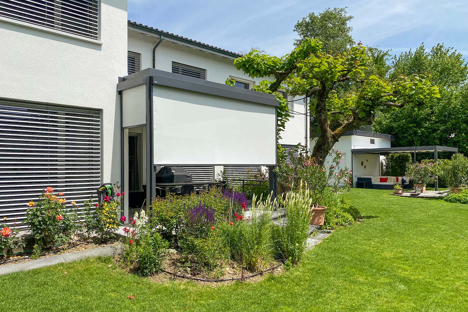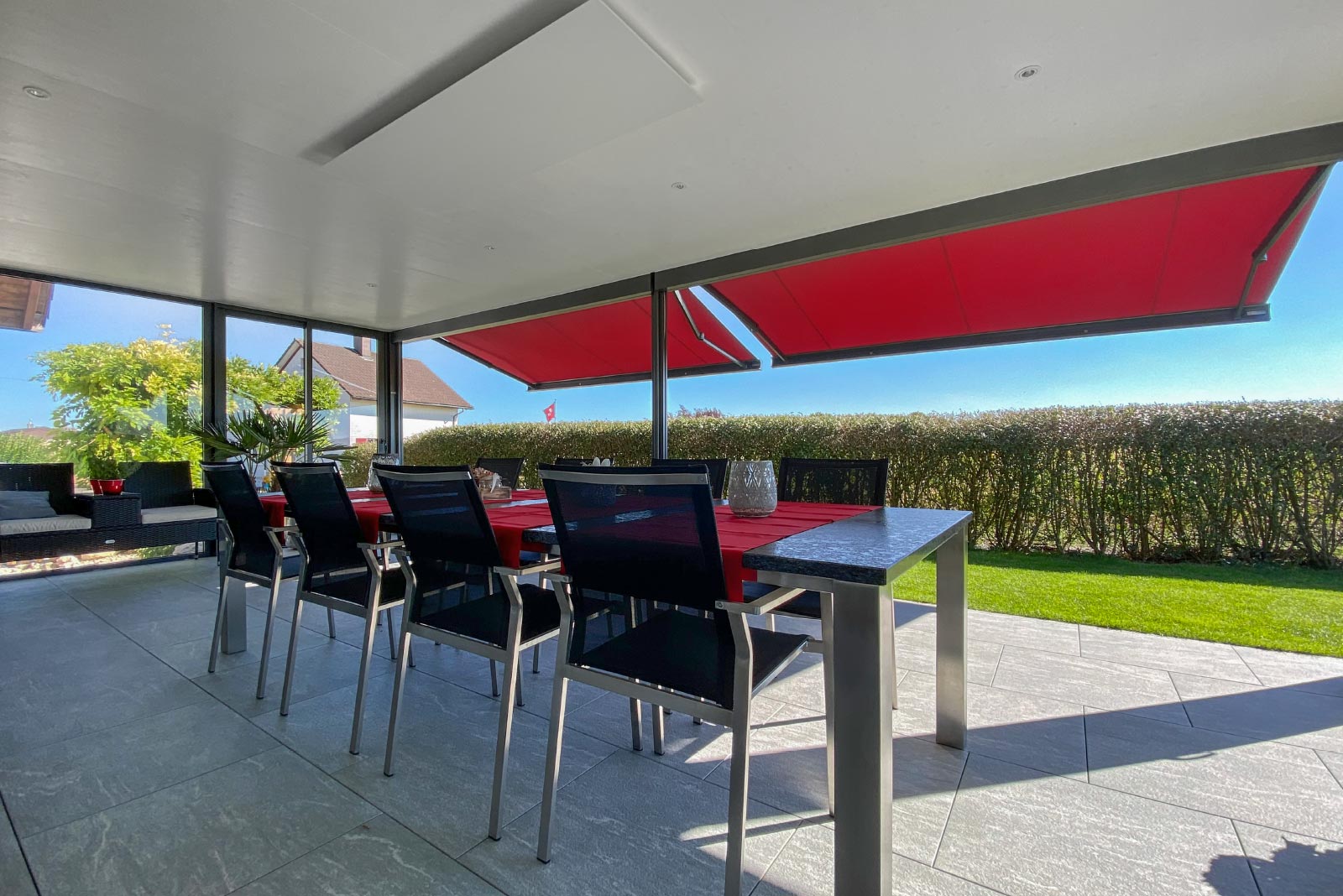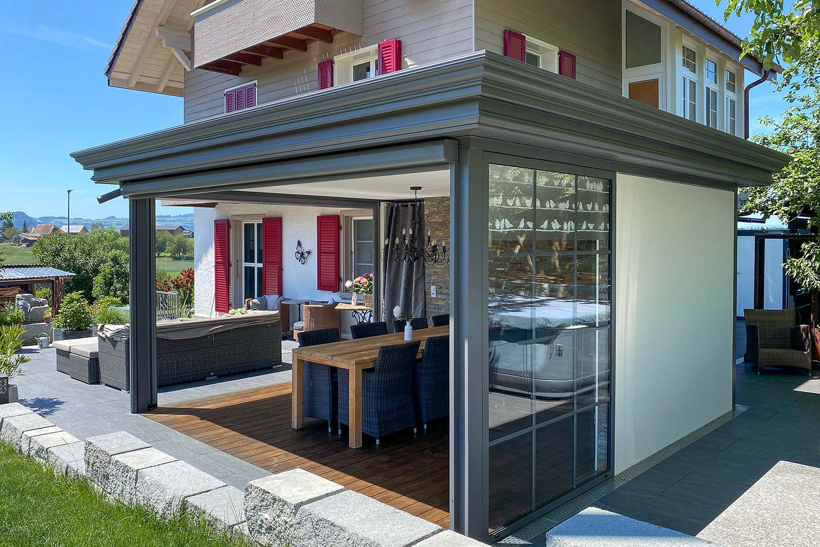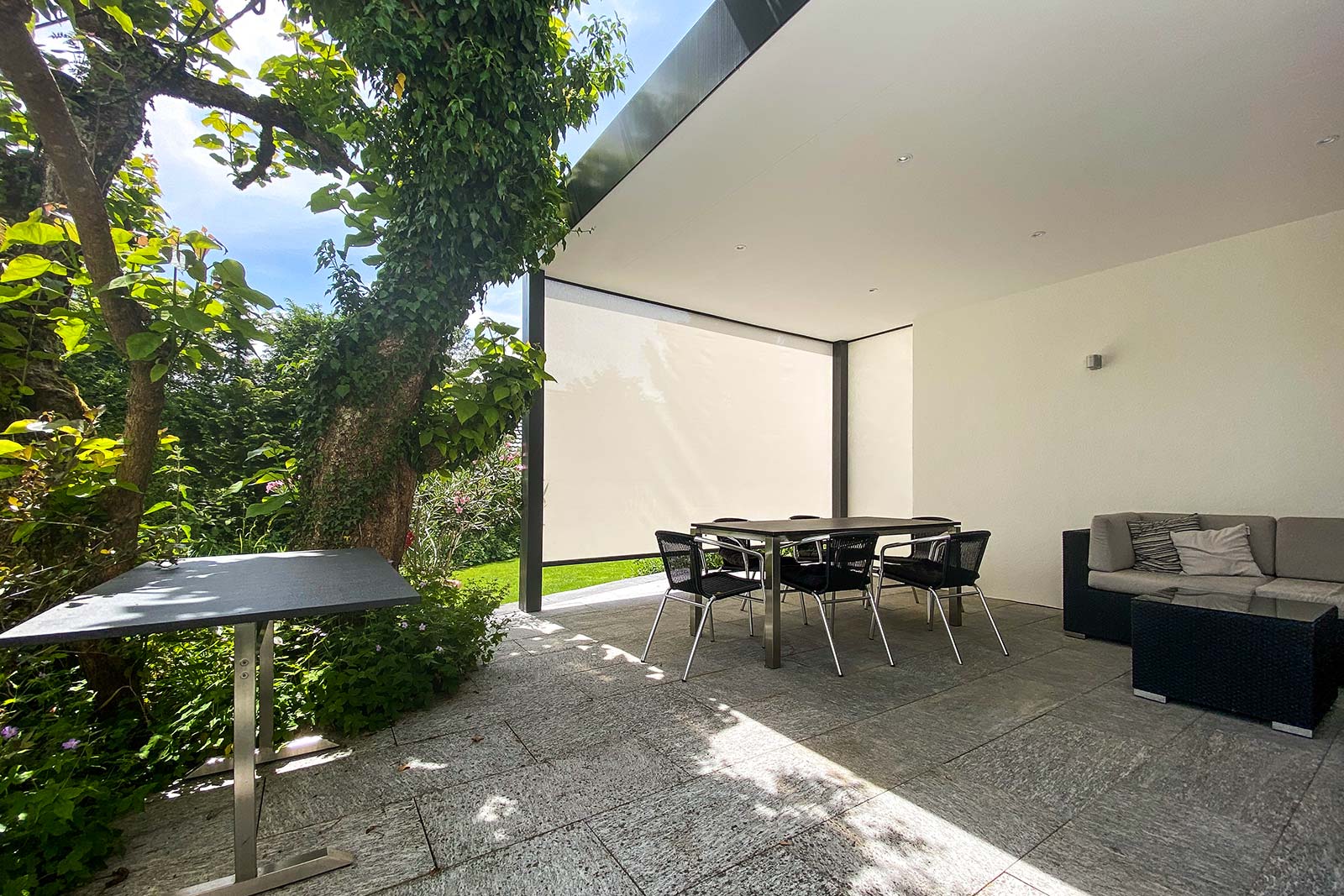 Ursprünglich war ein beheizbarer Immergarten geplant. Wegen der Situation in der Landwirtschaftszone war dies aber leider nicht möglich. Trotzdem haben wir mit der Bauherrschaft eine Wohlfühloase geschaffen, die sich sehen lässt. BERNA Elegance mit Windschutzverglasung, Senkrechtmarkisen, Kassettenmarkise und edler Steinverkleidung.