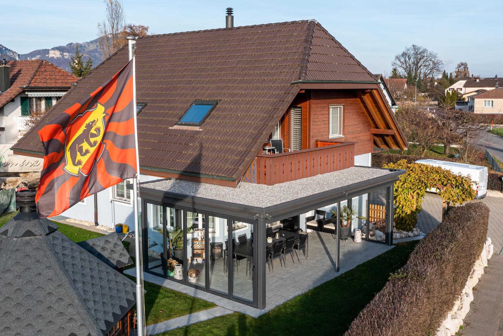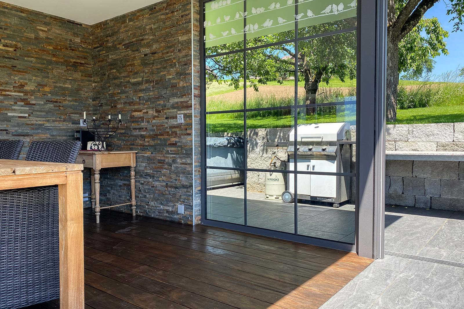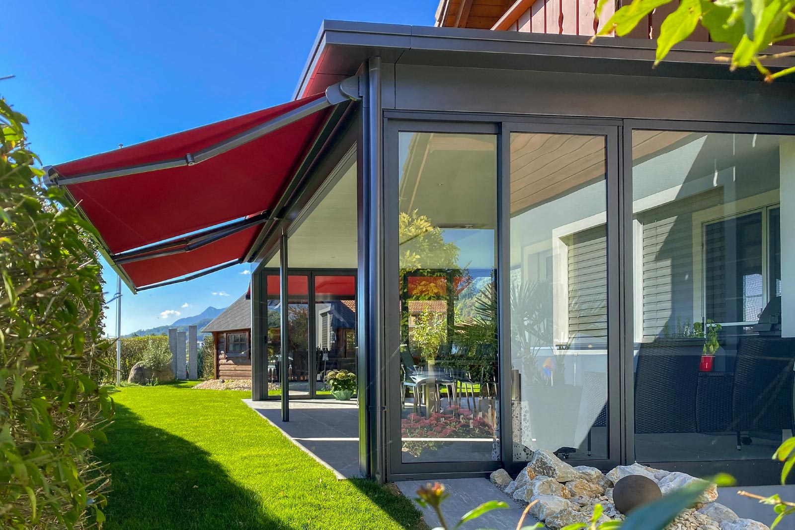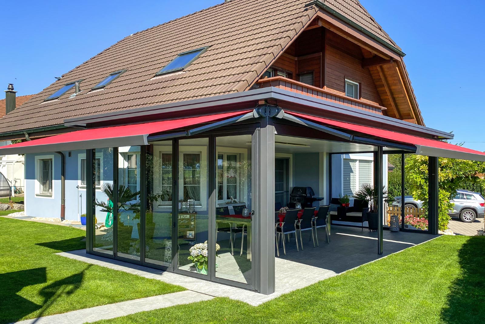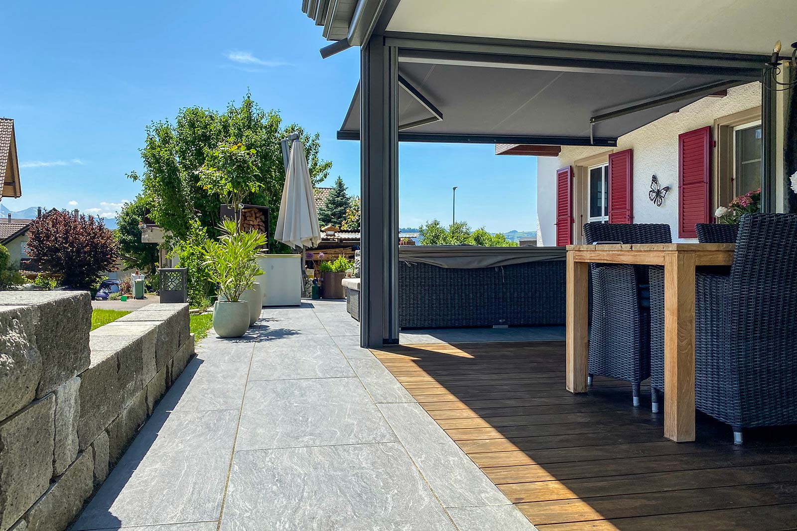 Ursprünglich war ein beheizbarer Immergarten geplant. Wegen der Situation in der Landwirtschaftszone war dies aber leider nicht möglich. Trotzdem haben wir mit der Bauherrschaft eine Wohlfühloase geschaffen, die sich sehen lässt. BERNA Elegance mit Windschutzverglasung, Senkrechtmarkisen, Kassettenmarkise und edler Steinverkleidung.