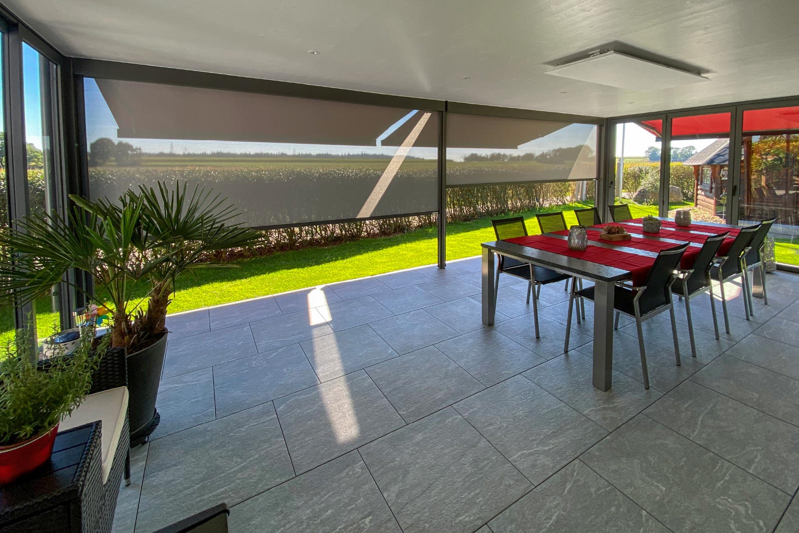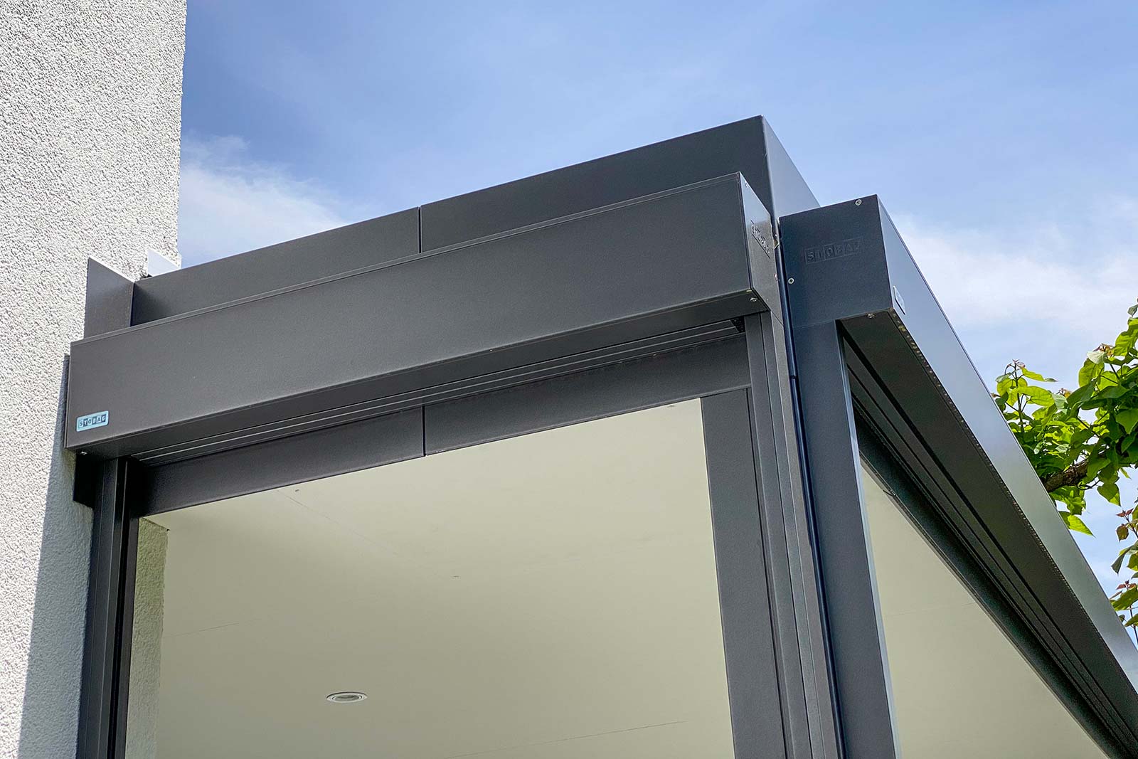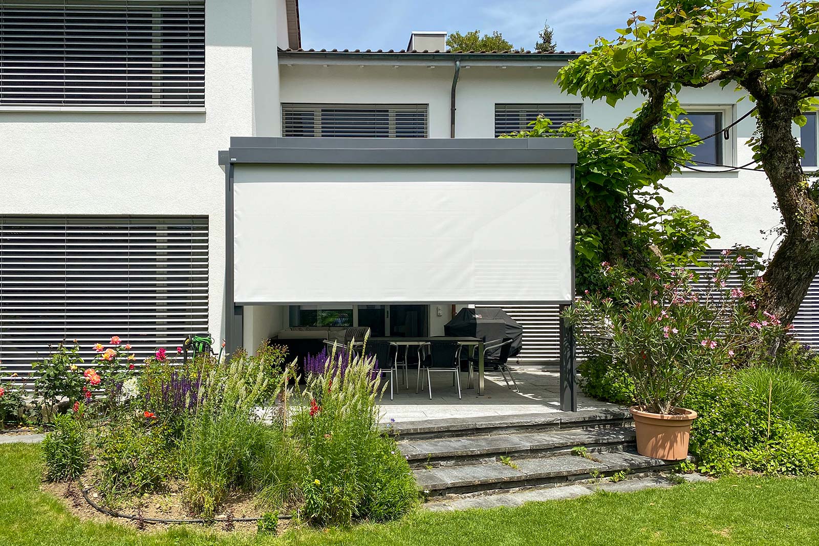 Als Sonnen-, Wind- oder auch Sichtschutz können Senkrechtmarkisen und Kassettenmarkisen angebracht werden. Zusätzlich kann die Lounge dank einer Wind-/Wetterschutzverglasung mit Isolierglas sogar als Wohnraum nutzbar gemacht werden.