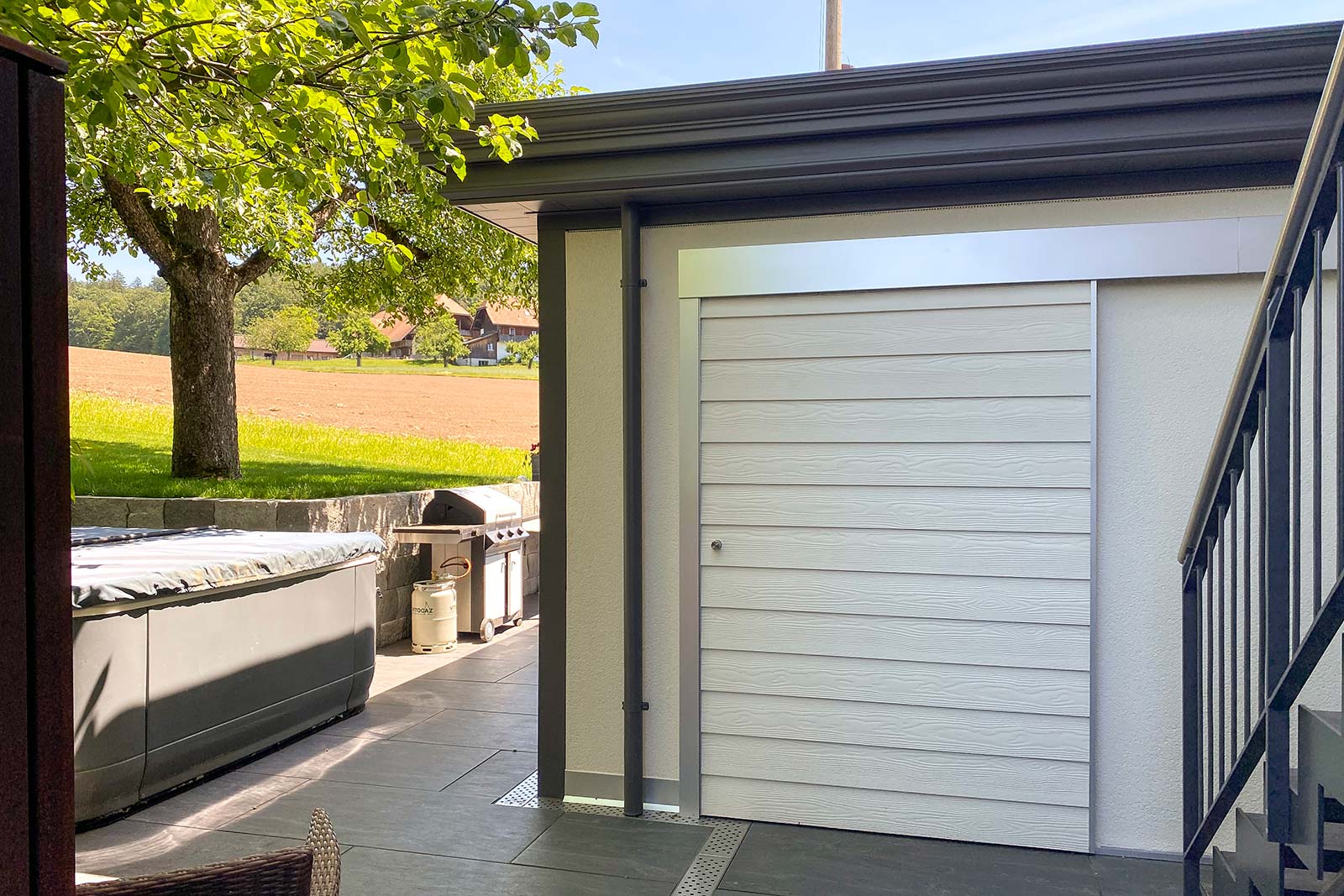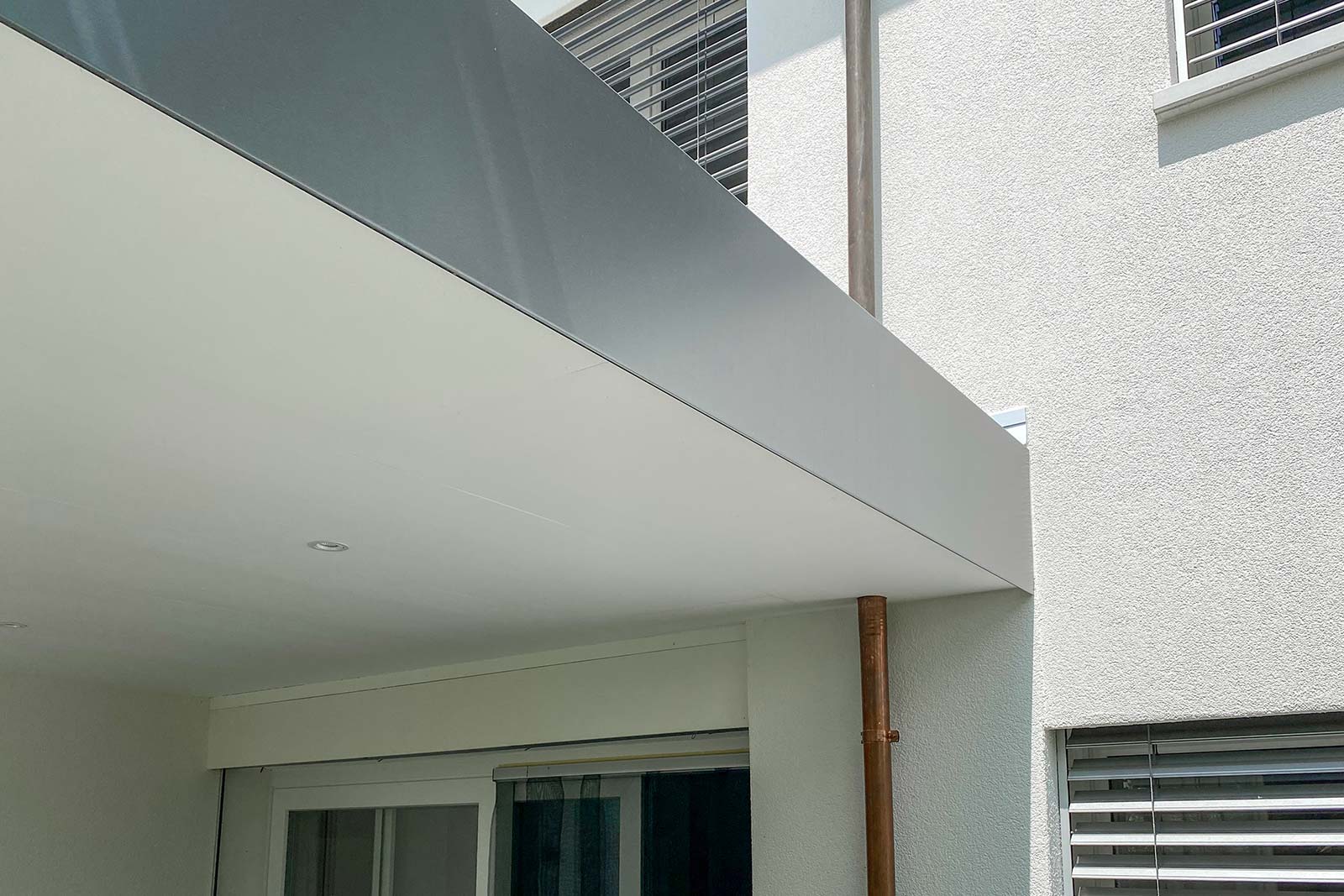 Auf den Seiten gegen Süden und Westen wünschte der Kunde eine Gelenkmarkise mit Sonnenschutz. Die Senkrechtmarkisen können an der Front zusätzlich auf Wunschhöhe angepasst werden und dienen ebenfalls als Sichtschutz. Decke innen mit weiss gestrichener Holzplatte. An beiden Seiten sind faltbarbare Fensterelemente angebracht, die platzsparend geöffnet werden können. Auf der Konstruktion wurde eine EPDM-Folie verlegt, die mit Rundkies abgedeckt wird. Der ursprüngliche Balkon im Obergeschoss integriert sich bestens über die Konstruktion hin.