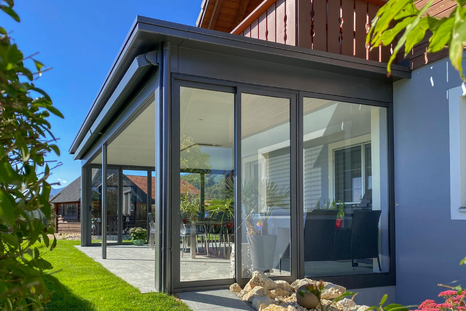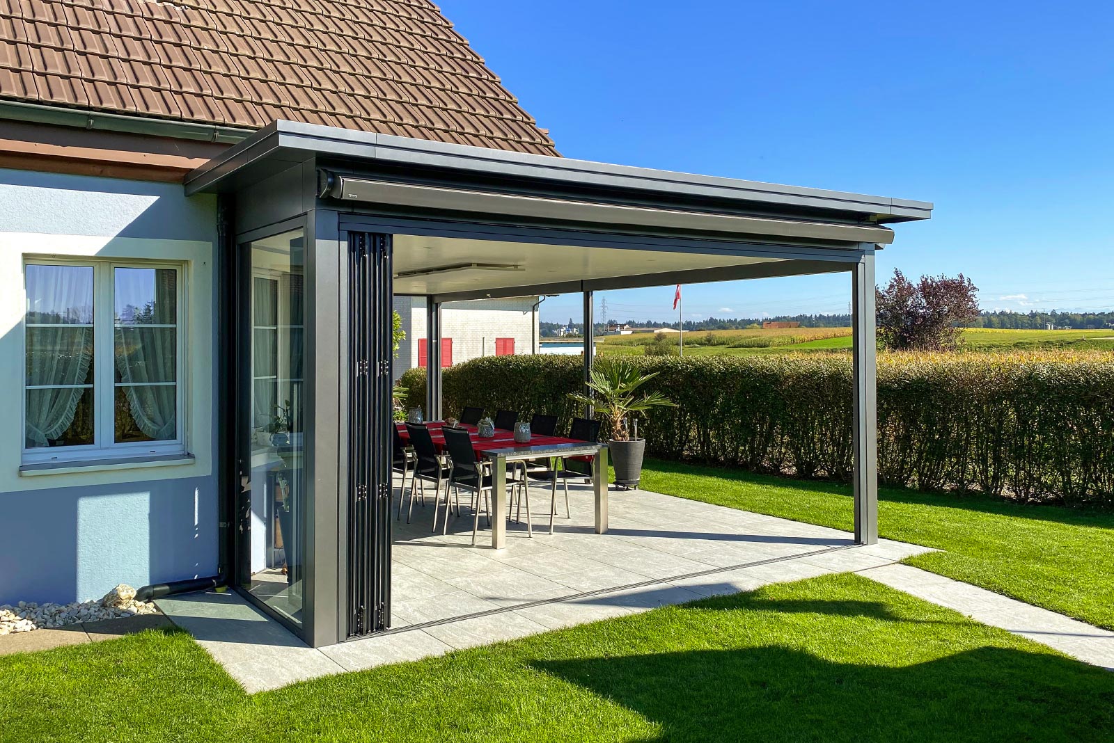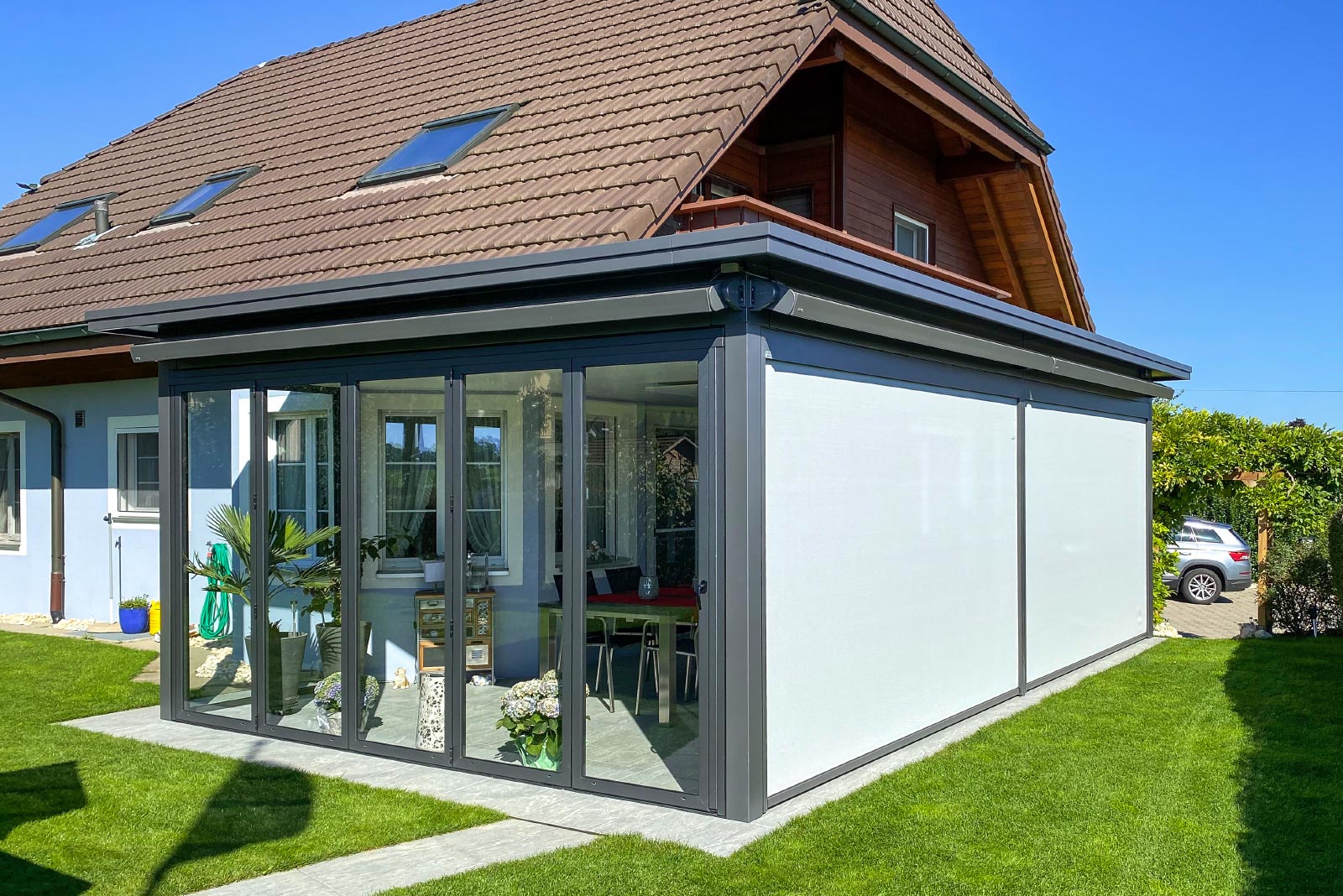 Die Terrassenlounge BERNA kann individuell ausgestattet werden, von der einfachen Überdachung bis zum richtigen Wintergarten.